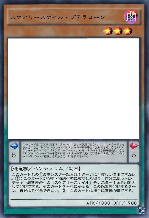 | このカード名の①のP効果は1ターンに1度しか使用できない。①:このカードともう片方の自分のPゾーンのカードのPスケールが5の場合に発動できる。自分のEXデッキからランク5の「スケアリースケイル」Xモンスター1体を特殊召喚し、自分のPゾーンのカード2枚をそのXモンスターの下に重ねてX素材にする。②:このカードがPゾーンに存在する限り自分はP召喚できない。 | |||