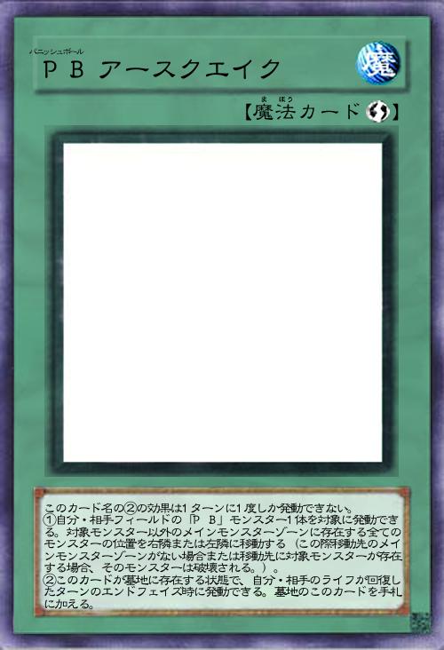 | このカード名の②の効果は1ターンに1度しか発動できない。 ①自分・相手フィールドの「P B」モンスター1体を対象に発動できる。対象モンスター以外のメインモンスターゾーンに存在する全てのモンスターの位置を右隣または左隣に移動する(この際移動先のメインモンスターゾーンがない場合または移動先に対象モンスターが存在する場合、そのモンスターは破壊される。)。 ②このカードが墓地に存在する状態で、自分・相手のライフが回復したターンのエンドフェイズ時に発動できる。墓地のこのカードを手札に加える。 | |||