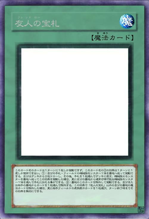 | このカード名のカードは1ターンに1枚しか発動できず、このカード名の②の効果は1ターンに1度しか使用できない。①:自分の手札・フィールドの機械族モンスター1体を墓地へ送って発動できる。自分はデッキから2枚ドローし、その後、手札を1枚選んでデッキに戻す。機械族Xモンスターを墓地へ送ってこの効果を発動した場合、更に自分の墓地から通常召喚可能な機械族モンスター1体を選んで手札に加える事ができる。②:墓地のこのカードを除外して発動できる。自分または相手の墓地からカードを1枚選んで除外する。この効果で「友人の宝札」以外の自分の墓地の魔法カードを除外した場合、更に相手フィールドの表側表示カードを1枚選び、ターン終了時までその効果を無効にできる。 | |||