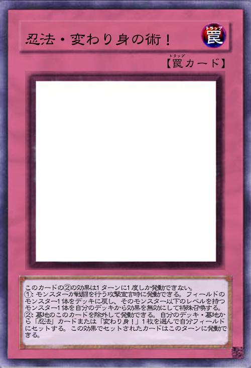| このカードの②の効果は1ターンに1度しか発動できない。 ①:モンスターが戦闘を行う攻撃宣言時に発動できる。フィールドのモンスター1体をデッキに戻し、そのモンスター以下のレベルを持つモンスター1体を自分のデッキから効果を無効にして特殊召喚する。②:墓地のこのカードを除外して発動できる。自分のデッキ・墓地から「忍法」カードまたは「変わり身!」1枚を選んで自分フィールドにセットする。この効果でセットされたカードはこのターンに発動できる。 | |||