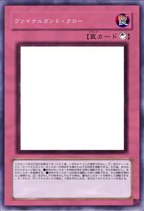 | このカード名の①②の効果は1ターンに1度、いずれか1つしか使用できない。①:自分フィールドに「ヴァイナルガンド」モンスターが存在する場合に以下の効果を発動できる。その後、自分は500ダメージ受ける。●相手がモンスターを特殊召喚する際に発動できる。それを無効にし、そのモンスターを破壊する。●相手がモンスターの効果を発動した時に発動できる。その発動を無効にし破壊する。②:自分のLPが相手のLP以下の場合、墓地のこのカードを除外して発動できる。デッキから「ヴァイナルガンドの雪女」1体を手札に加え、自分は1800ダメージを受ける。 | |||