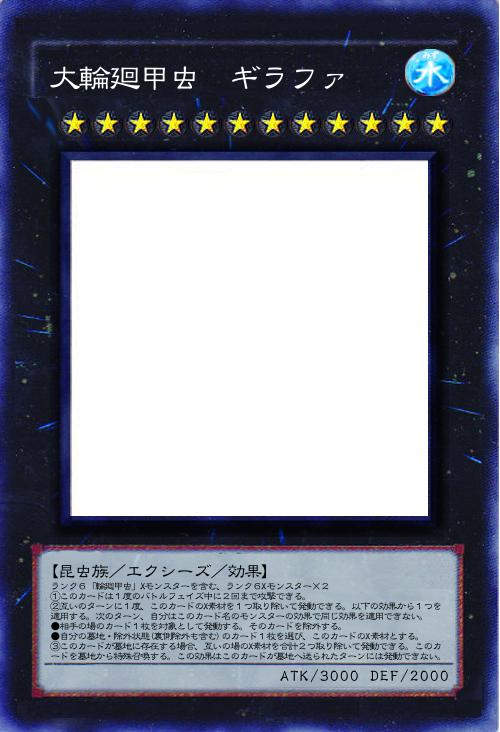 | ランク6「輪廻甲虫」Xモンスターを含む、ランク6Xモンスター×2 ①このカードは1度のバトルフェイズ中に2回まで攻撃できる。 ②互いのターンに1度、このカードのX素材を1つ取り除いて発動できる。以下の効果から1つを適用する。次のターン、自分はこのカード名のモンスターの効果で同じ効果を適用できない。 ●相手の場のカード1枚を対象として発動する。そのカードを除外する。 ●自分の墓地・除外状態(裏側除外も含む)のカード1枚を選び、このカードのX素材とする。 ③このカードが墓地に存在する場合、互いの場のX素材を合計2つ取り除いて発動できる。このカードを墓地から特殊召喚する。この効果はこのカードが墓地へ送られたターンには発動できない。 | |||