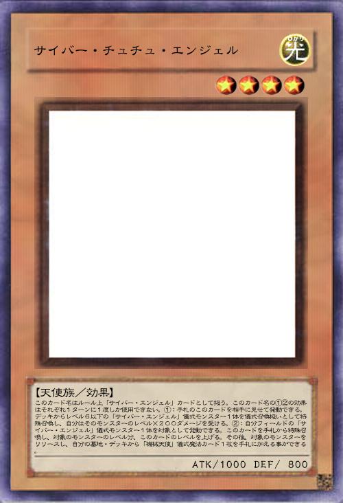| このカード名はルール上「サイバー・エンジェル」カードとして扱う。このカード名の①②の効果はそれぞれ1ターンに1度しか使用できない。①:手札のこのカードを相手に見せて発動できる。デッキからレベル6以下の「サイバー・エンジェル」儀式モンスター1体を儀式召喚扱いとして特殊召喚し、自分はそのモンスターのレベル×200ダメージを受ける。②:自分フィールドの「サイバー・エンジェル」儀式モンスター1体を対象として発動できる。このカードを手札から特殊召喚し、対象のモンスターのレベル分、このカードのレベルを上げる。その後、対象のモンスターをリリースし、自分の墓地・デッキから「機械天使」儀式魔法カード1枚を手札に加える事ができる。 | |||