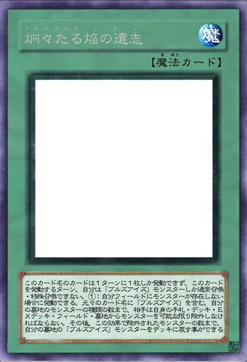 | このカード名のカードは1ターンに1枚しか発動できず、このカードを発動するターン、自分は「ブルズアイズ」モンスターしか通常召喚・特殊召喚できない。①:自分フィールドにモンスターが存在しない場合に発動できる。元々のカード名に「ブルズアイズ」を含む、自分の墓地のモンスターの種類の数まで、相手は自身の手札・デッキ・EXデッキ・フィールド・墓地からモンスターを可能な限り除外しなければならない。その後、この効果で除外されたモンスターの数まで、自分の墓地の「ブルズアイズ」モンスターをデッキに戻す事ができる。 | |||