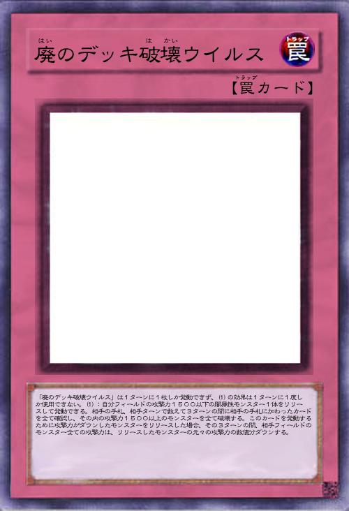 | 「廃のデッキ破壊ウイルス」は1ターンに1枚しか発動できず、(1)の効果は1ターンに1度しか使用できない。(1):自分フィールドの攻撃力1500以下の闇属性モンスター1体をリリースして発動できる。相手の手札、相手ターンで数えて3ターンの間に相手の手札に加わったカードを全て確認し、その内の攻撃力1500以上のモンスターを全て破壊する。このカードを発動するために攻撃力がダウンしたモンスターをリリースした場合、その3ターンの間、相手フィールドのモンスター全ての攻撃力は、リリースしたモンスターの元々の攻撃力の数値分ダウンする。 | |||