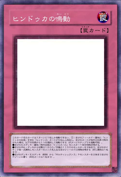 | このカード名のカードは1ターンに1枚しか発動できない。①:自分のフィールド・墓地に「ヒンドゥカの託宣」を含む「ヒンドゥカ」カードが5枚以上存在し、自分のカードが相手の効果で除外された場合、以下の効果から1つを選択して発動できる(ダメージステップでも発動可能)。 ●自分のEXデッキ・墓地・除外状態の「トリピタパス」モンスター1体を特殊召喚する。 ●自分の手札・デッキから攻撃力1500/守備力1100のモンスターを3体まで、自分のサイキック族・炎属性Lモンスターのリンク先となる自分フィールドに特殊召喚する(同じ属性は1枚まで)。 ●自分のデッキ・EXデッキ(表側)から「ギルティシュヴァラ」Pモンスターを2体まで自分のPゾーンに置く(同名カードは1枚まで)。 | |||