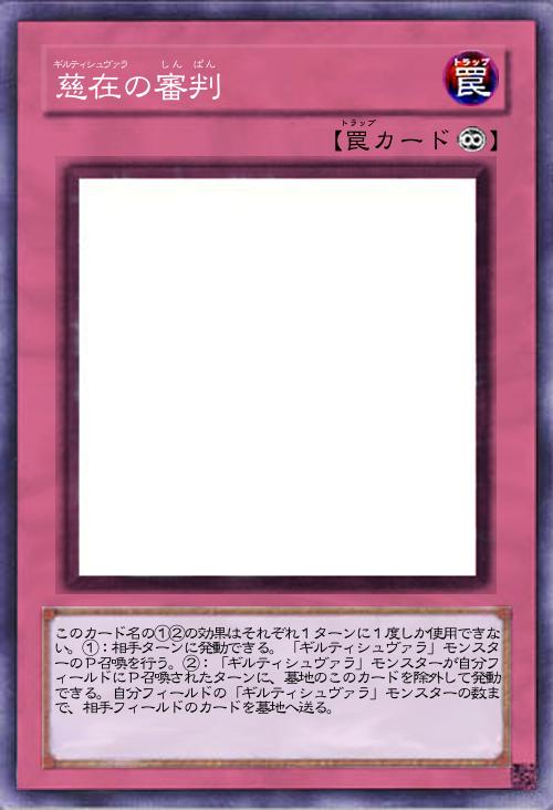 | このカード名の①②の効果はそれぞれ1ターンに1度しか使用できない。①:相手ターンに発動できる。「ギルティシュヴァラ」モンスターのP召喚を行う。②:「ギルティシュヴァラ」モンスターが自分フィールドにP召喚されたターンに、墓地のこのカードを除外して発動できる。自分フィールドの「ギルティシュヴァラ」モンスターの数まで、相手フィールドのカードを墓地へ送る。 | |||
