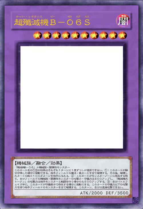 | 「殲滅機B-06」+機械族・闇属性モンスター このカード名の①③の効果はそれぞれ1ターンに1度ずつしか使用できない。①:このカードが融合召喚した場合に発動できる。相手フィールドの魔法・罠カードを全て破壊する。その後、破壊したカードの数×100ダメージを相手に与える。②:このカードがモンスターゾーンに存在する限り、自分フィールドの機械族・闇属性モンスターの攻撃力・守備力は500アップし、「殲滅機兵トークン」の攻撃力は相手モンスターと戦闘を行う場合のみ500アップする。③:自分バトルフェイズ中に、このカードが守備表示で存在する場合に発動できる。このカードの守備力以下の攻撃力を持つ相手フィールドのモンスターを全て破壊する。このターン、自分は直接攻撃できない。 | |||