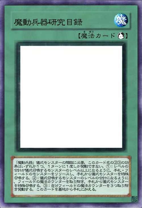 | 「魔動兵器」儀式モンスターの降臨に必要。このカード名の②③の効果はいずれか1つ、1ターンに1度しか発動できない。①:レベルの合計が儀式召喚するモンスターのレベル以上になるように、手札・フィールドのモンスターをリリースし、手札から儀式モンスターを特殊召喚する。②:儀式召喚するモンスターのレベルの合計になるように、フィールドの魔法カウンターを取り除き、手札から儀式モンスターを特殊召喚する。③:自分フィールドの魔法カウンターを3つ取り除き発動する。このカードを墓地から手札に加える。 | |||