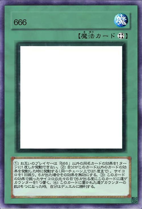 | ①:お互いのプレイヤーは「666」以外の同名カードの効果を1ターンに1度しか発動できない。②:自分がこのカード以外のカードの効果を発動した時に発動する(同一チェーン上では1度まで)。サイコロを1回振り、6が出た場合その効果を無効にする。③:このカードの効果で振ったサイコロの元々の目で6が出る度にこのカードに運ゲカウンターを1つ置く。④:このカードに置かれた運ゲカウンターの数が6つになった時、自分はデュエルに勝利する。 | |||