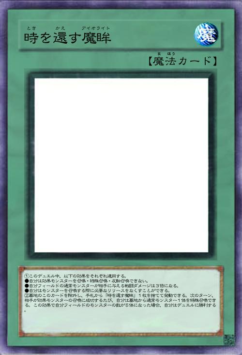 | ①このデュエル中、以下の効果をそれぞれ適用する。 ●自分は効果モンスターを召喚・特殊召喚・反転召喚できない。 ●自分フィールドの通常モンスターが相手に与える戦闘ダメージは3倍になる。 ●自分はモンスターを召喚する際に必要なリリースをなくすことができる。 ②墓地のこのカードを除外し、手札から「時を還す魔眸」1枚を捨てて発動できる。次のターン、相手が効果モンスターの召喚に成功するたび、自分は墓地から通常モンスター1体を特殊召喚できる。この効果で自分フィールドのモンスターの数が5体になった場合、自分はデュエルに勝利する。 | |||