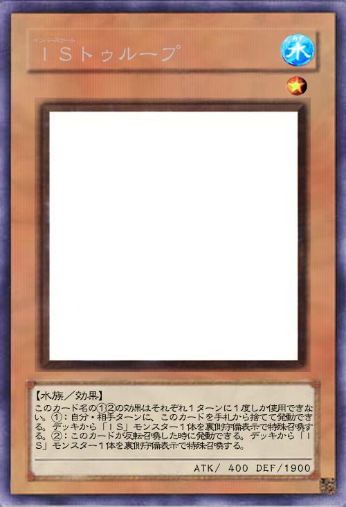 | このカード名の①②の効果はそれぞれ1ターンに1度しか使用できない。①:自分・相手ターンに、このカードを手札から捨てて発動できる。デッキから「IS」モンスター1体を裏側守備表示で特殊召喚する。②:このカードが反転召喚した時に発動できる。デッキから「IS」モンスター1体を裏側守備表示で特殊召喚する。 | |||