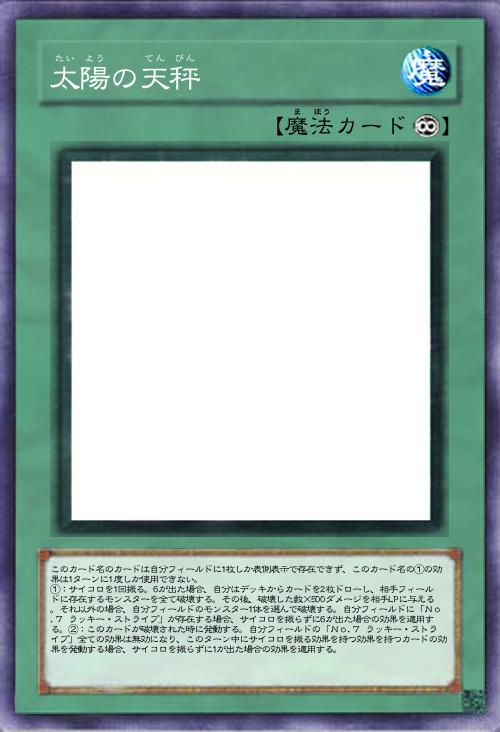 | このカード名のカードは自分フィールドに1枚しか表側表示で存在できず、このカード名の①の効果は1ターンに1度しか使用できない。 ①:サイコロを1回振る。6が出た場合、自分はデッキからカードを2枚ドローし、相手フィールドに存在するモンスターを全て破壊する。その後、破壊した数×500ダメージを相手LPに与える。それ以外の場合、自分フィールドのモンスター1体を選んで破壊する。自分フィールドに「No.7 ラッキー・ストライプ」が存在する場合、サイコロを振らずに6が出た場合の効果を適用する。②:このカードが破壊された時に発動する。自分フィールドの「No.7 ラッキー・ストライプ」全ての効果は無効になり、このターン中にサイコロを振る効果を持つ効果を持つカードの効果を発動する場合、サイコロを振らずに1が出た場合の効果を適用する。 | |||