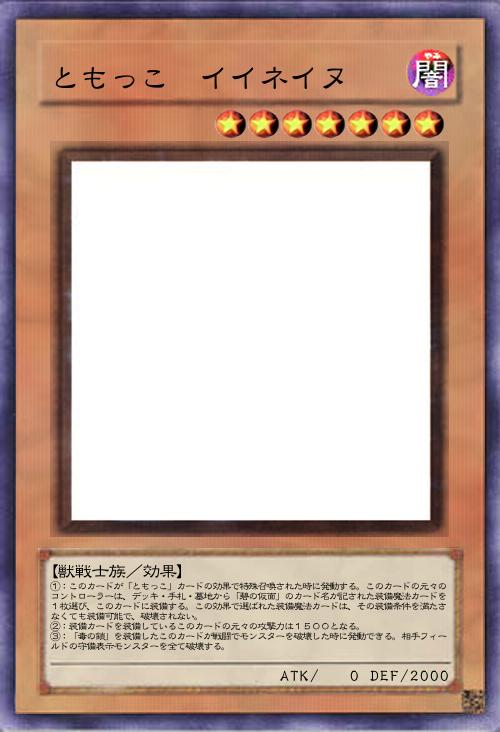| ①:このカードが「ともっこ」カードの効果で特殊召喚された時に発動する。このカードの元々のコントローラーは、デッキ・手札・墓地から「碧の仮面」のカード名が記された装備魔法カードを1枚選び、このカードに装備する。この効果で選ばれた装備魔法カードは、その装備条件を満たさなくても装備可能で、破壊されない。 ②:装備カードを装備しているこのカードの元々の攻撃力は1500となる。 ③:「毒の鎖」を装備したこのカードが戦闘でモンスターを破壊した時に発動できる。相手フィールドの守備表示モンスターを全て破壊する。 | |||