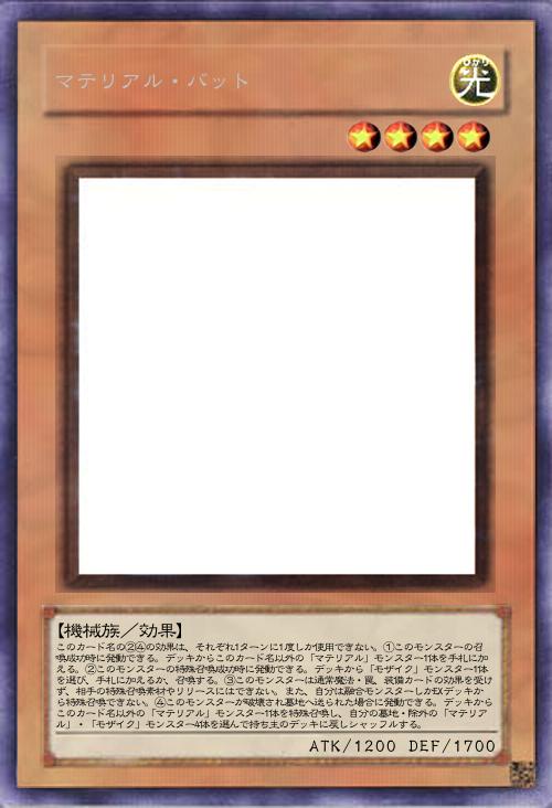 | このカード名の②④の効果は、それぞれ1ターンに1度しか使用できない。①このモンスターの召喚成功時に発動できる。デッキからこのカード名以外の「マテリアル」モンスター1体を手札に加える。②このモンスターの特殊召喚成功時に発動できる。デッキから「モザイク」モンスター1体を選び、手札に加えるか、召喚する。③このモンスターは通常魔法・罠、装備カードの効果を受けず、相手の特殊召喚素材やリリースにはできない。また、自分は融合モンスターしかEXデッキから特殊召喚できない。④このモンスターが破壊され墓地へ送られた場合に発動できる。デッキからこのカード名以外の「マテリアル」モンスター1体を特殊召喚し、自分の墓地・除外の「マテリアル」・「モザイク」モンスター4体を選んで持ち主のデッキに戻しシャッフルする。 | |||
