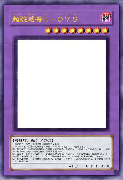 | 「殲滅機E-07」+機械族・闇属性モンスター このカード名の①③の効果はそれぞれ1ターンに1度ずつしか使用できない。 ①:相手がカードの効果を発動した時に発動できる。自分フィールドの「レギオニス」カードはターン終了時までその相手が発動した効果を受けない。 ②:このカードがモンスターゾーンに存在する限り、自分フィールドの機械族・闇属性モンスターの攻撃力・守備力は500アップし、「殲滅機兵トークン」は相手の効果の対象にならない。 ③:相手が罠カードの効果を発動した時、このカードをリリースして発動できる。その発動を無効にし、破壊する。 | |||