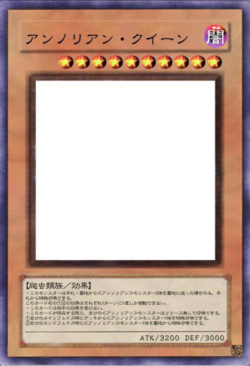 | ・このモンスターは手札・墓地から≪アンノリアン≫モンスター2体を墓地に送った場合のみ、手札から特殊召喚できる。 このカード名の①②の効果はそれぞれ1ターンに1度しか発動できない。 ・このカードは相手の効果を受けない。 ・このカードが存在する限り、自分の≪アンノリアン≫モンスターはリリース無しで召喚できる。 ①自分のメインフェイズ時にデッキから≪アンノリアン≫モンスター1体を特殊召喚できる。 ②自分のエンドフェイズ時に≪アンノリアン≫モンスター1体を墓地から特殊召喚できる。 | |||