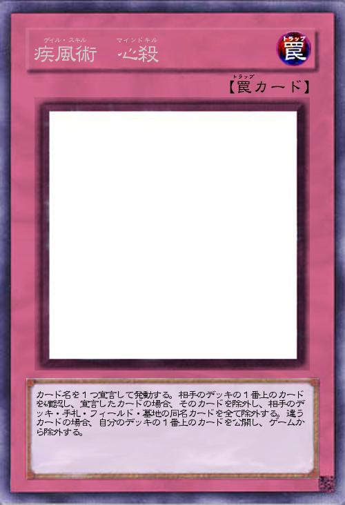 | カード名を1つ宣言して発動する。相手のデッキの1番上のカードを確認し、宣言したカードの場合、そのカードを除外し、相手のデッキ・手札・フィールド・墓地の同名カードを全て除外する。違うカードの場合、自分のデッキの1番上のカードを公開し、ゲームから除外する。 | |||