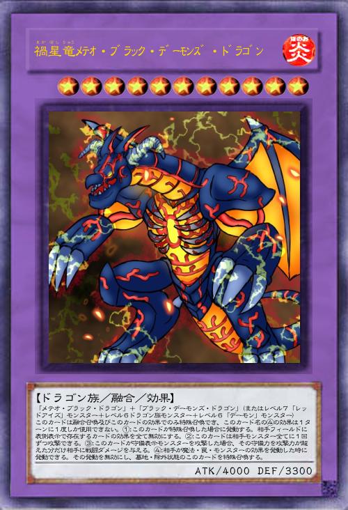 | 「メテオ・ブラック・ドラゴン」+「ブラック・デーモンズ・ドラゴン」(またはレベル7「レッドアイズ」モンスター+レベル6ドラゴン族モンスター+レベル6「デーモン」モンスター) このカードは融合召喚及びこのカードの効果でのみ特殊召喚でき、このカード名の④の効果は1ターンに1度しか使用できない。①:このカードが特殊召喚した場合に発動する。相手フィールドに表側表示で存在するカードの効果を全て無効にする。②:このカードは相手モンスター全てに1回ずつ攻撃できる。③:このカードが守備表示モンスターを攻撃した場合、その守備力を攻撃力が超えた分だけ相手に戦闘ダメージを与える。④:相手が魔法・罠・モンスターの効果を発動した時に発動できる。その発動を無効にし、墓地・除外状態のこのカードを特殊召喚する。 | |||