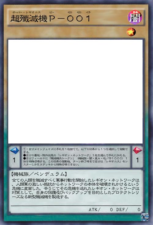 | ①:自分メインフェイズに手札を1枚捨てて、以下の効果から1つを選択して発動できる。 ●自分の墓地・除外状態の「レギオン・ネットワーク」1枚を選んで手札に加える。 ●自分フィールドに「殲滅機兵トークン」(機械族・闇・星4・攻/守1000)1体を特殊召喚する。この効果の発動後、ターン終了時まで自分は「レギオニス」モンスターしかEXデッキから特殊召喚できない。 | |||