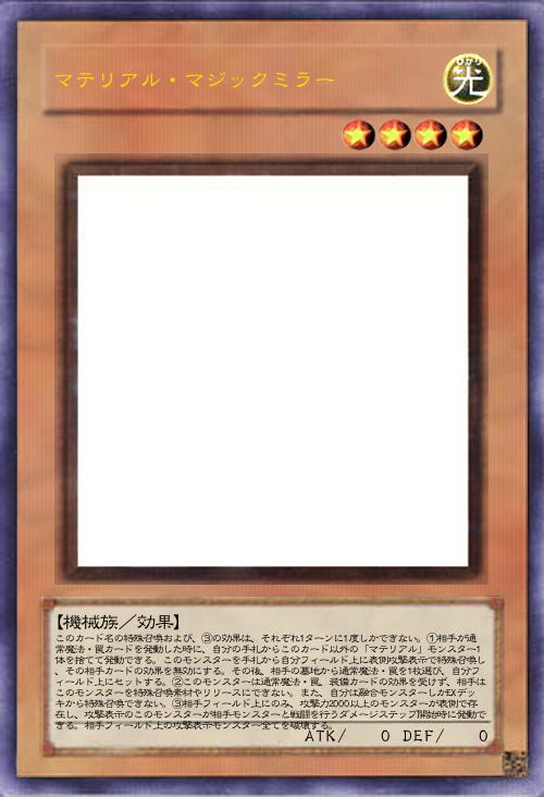 | このカード名の特殊召喚および、③の効果は、それぞれ1ターンに1度しかできない。①相手が通常魔法・罠カードを発動した時に、自分の手札からこのカード以外の「マテリアル」モンスター1体を捨てて発動できる。このモンスターを手札から自分フィールド上に表側攻撃表示で特殊召喚し、その相手カードの効果を無効にする。その後、相手の墓地から通常魔法・罠を1枚選び、自分フィールド上にセットする。②このモンスターは通常魔法・罠、装備カードの効果を受けず、相手はこのモンスターを特殊召喚素材やリリースにできない。また、自分は融合モンスターしかEXデッキから特殊召喚できない。③相手フィールド上にのみ、攻撃力2000以上のモンスターが表側で存在し、攻撃表示のこのモンスターが相手モンスターと戦闘を行うダメージステップ開始時に発動できる。相手フィールド上の攻撃表示モンスター全てを破壊する。 | |||
