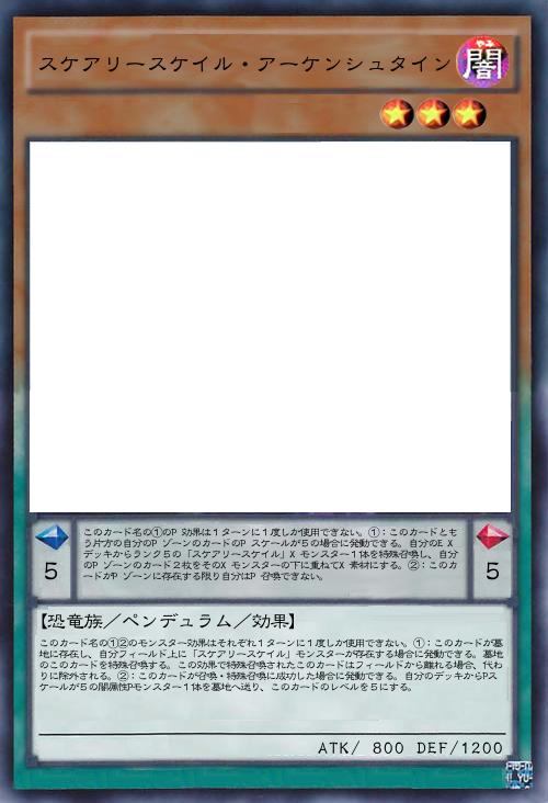 | このカード名の①のP効果は1ターンに1度しか使用できない。①:このカードともう片方の自分のPゾーンのカードのPスケールが5の場合に発動できる。自分のEXデッキからランク5の「スケアリースケイル」Xモンスター1体を特殊召喚し、自分のPゾーンのカード2枚をそのXモンスターの下に重ねてX素材にする。②:このカードがPゾーンに存在する限り自分はP召喚できない。 | |||