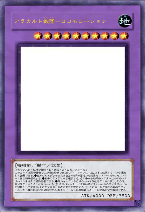 | 効果モンスター以外の融合・S・儀式・X・Lモンスター×3 このカードは融合召喚でしか特殊召喚できない。①:1ターンに1度、以下の効果から1つを選択して発動できる。●自分のEXデッキまたは自分・相手の墓地から効果モンスター以外のモンスター1体を特殊召喚する。●相手のEXデッキを確認する。その中から効果モンスター以外のモンスター1体を選んで特殊召喚できる。●除外されている自分のカード3枚をデッキに戻し、その後、自分はデッキから1枚ドローする。②:自分バトルフェイズ開始時にフィールドのモンスター1体を対象としてできる。そのモンスターの表示形式を変更する。③:このカードが相手の効果でフィールドから離れた場合に発動できる。相手フィールドの表側表示カードの効果を全て無効化する。 | |||