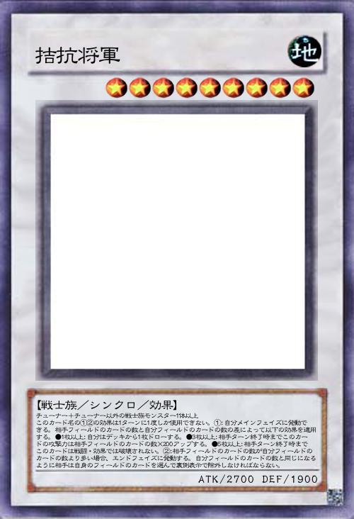 | チューナー+チューナー以外の戦士族モンスター1体以上 このカード名の①②の効果は1ターンに1度しか使用できない。①:自分メインフェイズに発動できる。相手フィールドのカードの数と自分フィールドのカードの数の差によって以下の効果を適用する。●1枚以上:自分はデッキから1枚ドローする。●3枚以上:相手ターン終了時までこのカードの攻撃力は相手フィールドのカードの数×200アップする。●5枚以上:相手ターン終了時までこのカードは戦闘・効果では破壊されない。②:相手フィールドのカードの数が自分フィールドのカードの数より多い場合、エンドフェイズに発動する。自分フィールドのカードの数と同じになるように相手は自身のフィールドのカードを選んで裏側表示で除外しなければならない。 | |||