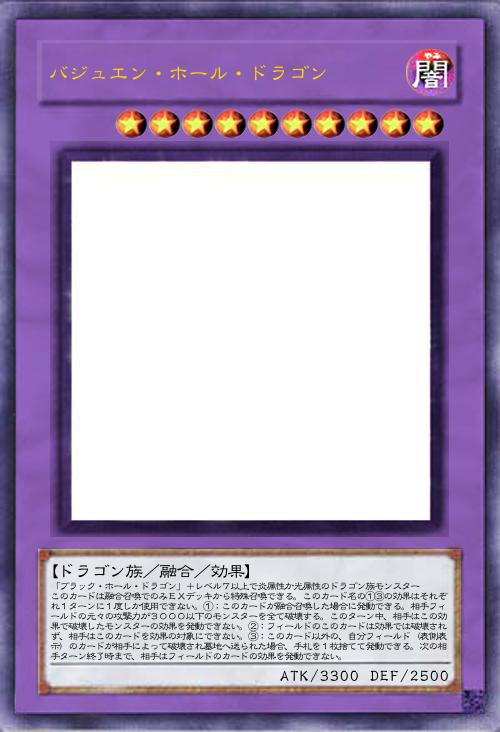 | 「ブラック・ホール・ドラゴン」+レベル7以上で炎属性か光属性のドラゴン族モンスター このカードは融合召喚でのみEXデッキから特殊召喚できる。このカード名の①③の効果はそれぞれ1ターンに1度しか使用できない。①:このカードが融合召喚した場合に発動できる。相手フィールドの元々の攻撃力が3000以下のモンスターを全て破壊する。このターン中、相手はこの効果で破壊したモンスターの効果を発動できない。②:フィールドのこのカードは効果では破壊されず、相手はこのカードを効果の対象にできない。③:このカード以外の、自分フィールド(表側表示)のカードが相手によって破壊され墓地へ送られた場合、手札を1枚捨てて発動できる。次の相手ターン終了時まで、相手はフィールドのカードの効果を発動できない。 | |||