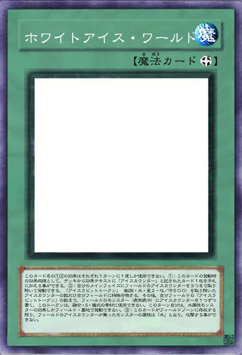 | このカード名の①②の効果はそれぞれ1ターンに1度しか使用できない。①:このカードの発動時の効果処理として、デッキから効果テキストに「アイスカウンター」と記されたカード1枚を手札に加える事ができる。②:自分のメインフェイズにフィールドのアイスカウンターを3つまで取り除いて発動できる。「アイスラビットトークン」(獣族・水・星2・攻/守500)を取り除いたアイスカウンターの数だけ自分フィールドに特殊召喚する。その後、自分フィールドの「アイスラビットトークン」の数まで、フィールドのモンスター(表側表示)にアイスカウンターを1つずつ置く。このトークンは、融合・S・儀式の素材に使用できない。このターン自分は、水属性モンスターの効果しかフィールド・墓地で発動できない。③:このカードがフィールドゾーンに存在する限り、フィールドのアイスカウンターが乗ったモンスターの属性は「水」となり、攻撃する事ができない。 | |||