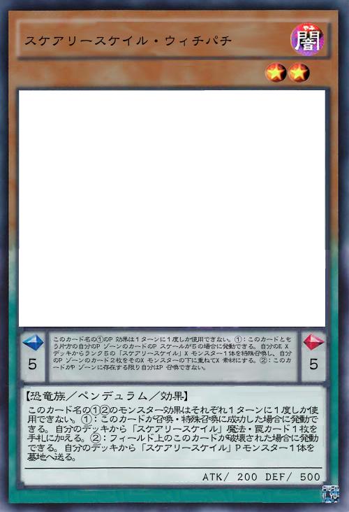| このカード名の①のP効果は1ターンに1度しか使用できない。①:このカードともう片方の自分のPゾーンのカードのPスケールが5の場合に発動できる。自分のEXデッキからランク5の「スケアリースケイル」Xモンスター1体を特殊召喚し、自分のPゾーンのカード2枚をそのXモンスターの下に重ねてX素材にする。②:このカードがPゾーンに存在する限り自分はP召喚できない。 | |||