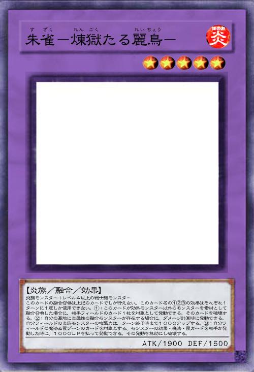 「以前、私の「朱雀」モンスターに沢山のコメントをしていただいたルーナエさんが考えたテーマということで、この「朱雀」を投稿したいと思います。「朱雀」は南を守る神様らしいので、モンスターゾーンから見て南(?)の魔法・罠ゾーンを守る効果を加えました。」(2024-01-25 20:37)