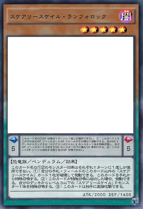 | このカード名の①のP効果は1ターンに1度しか使用できない。①:このカードともう片方の自分のPゾーンのカードのPスケールが5の場合に発動できる。自分のEXデッキからランク5の「スケアリースケイル」Xモンスター1体を特殊召喚し、自分のPゾーンのカード2枚をそのXモンスターの下に重ねてX素材にする。②:このカードがPゾーンに存在する限り自分はP召喚できない。 | |||
