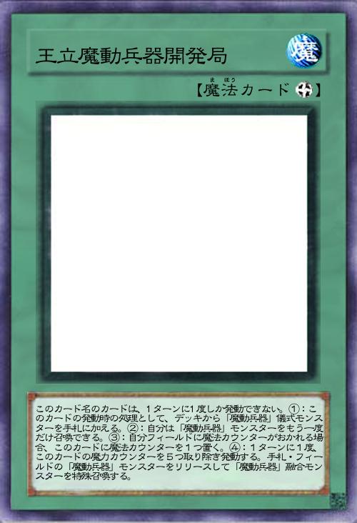| このカード名のカードは、1ターンに1度しか発動できない。①:このカードの発動時の処理として、デッキから「魔動兵器」儀式モンスターを手札に加える。②:自分は「魔動兵器」モンスターをもう一度だけ召喚できる。③:自分フィールドに魔法カウンターがおかれる場合、このカードに魔法カウンターを1つ置く。④:1ターンに1度、このカードの魔力カウンターを5つ取り除き発動する。手札・フィールドの「魔動兵器」モンスターをリリースして「魔動兵器」融合モンスターを特殊召喚する。 | |||