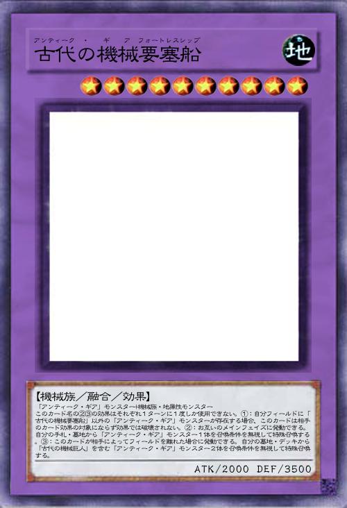 | 「アンティーク・ギア」モンスター+機械族・地属性モンスター このカード名の②③の効果はそれぞれ1ターンに1度しか使用できない。①:自分フィールドに「古代の機械要塞船」以外の「アンティーク・ギア」モンスターが存在する場合、このカードは相手のカード効果の対象にならず効果では破壊されない。②:お互いのメインフェイズに発動できる。自分の手札・墓地から「アンティーク・ギア」モンスター1体を召喚条件を無視して特殊召喚する。③:このカードが相手によってフィールドを離れた場合に発動できる。自分の墓地・デッキから「古代の機械巨人」を含む「アンティーク・ギア」モンスター2体を召喚条件を無視して特殊召喚する。 | |||