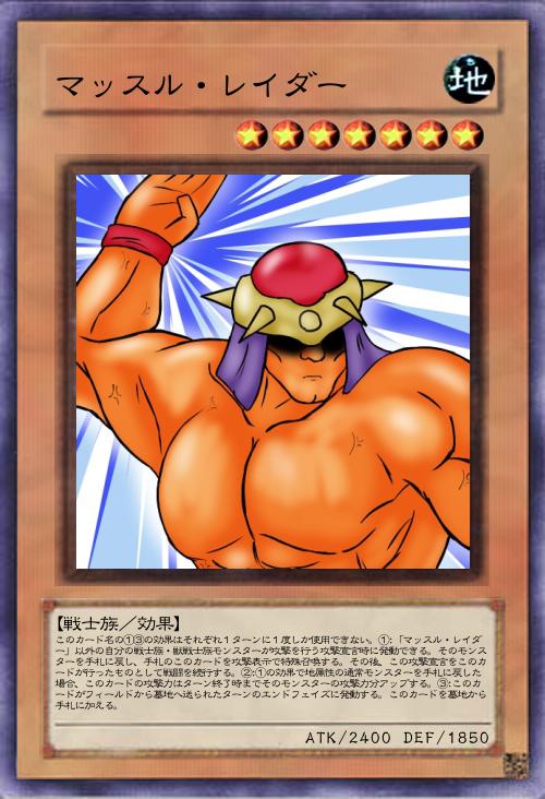 | このカード名の①③の効果はそれぞれ1ターンに1度しか使用できない。①:「マッスル・レイダー」以外の自分の戦士族・獣戦士族モンスターが攻撃を行う攻撃宣言時に発動できる。そのモンスターを手札に戻し、手札のこのカードを攻撃表示で特殊召喚する。その後、この攻撃宣言をこのカードが行ったものとして戦闘を続行する。②:①の効果で地属性の通常モンスターを手札に戻した場合、このカードの攻撃力はターン終了時までそのモンスターの攻撃力分アップする。③:このカードがフィールドから墓地へ送られたターンのエンドフェイズに発動する。このカードを墓地から手札に加える。 | |||