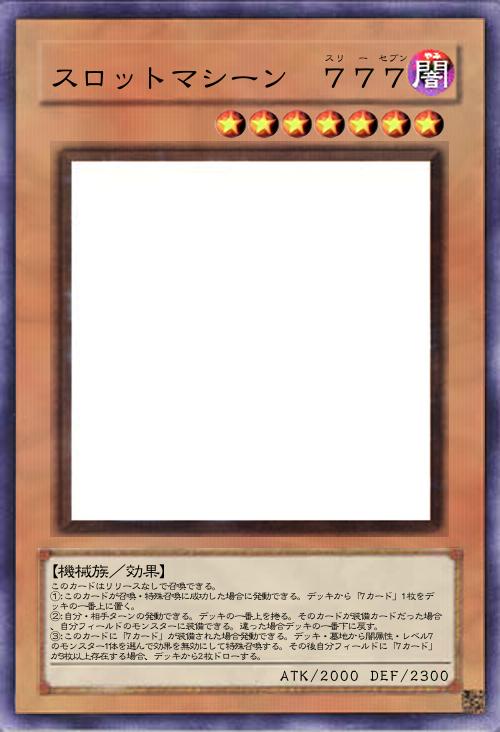 | このカードはリリースなしで召喚できる。 ①:このカードが召喚・特殊召喚に成功した場合に発動できる。デッキから「7カード」1枚をデッキの一番上に置く。 ②:自分・相手ターンの発動できる。デッキの一番上を捲る。そのカードが装備カードだった場合、自分フィールドのモンスターに装備できる。違った場合デッキの一番下に戻す。 ③:このカードに「7カード」が装備された場合発動できる。デッキ・墓地から闇属性・レベル7のモンスター1体を選んで効果を無効にして特殊召喚する。その後自分フィールドに「7カード」が3枚以上存在する場合、デッキから2枚ドローする。 | |||