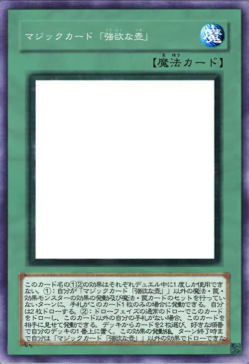 | このカード名の①②の効果はそれぞれデュエル中に1度しか使用できない。①:自分が「マジックカード「強欲な壺」」以外の魔法・罠・効果モンスターの効果の発動及び魔法・罠カードのセットを行っていないターンに、手札がこのカード1枚のみの場合に発動できる。自分は2枚ドローする。②:ドローフェイズの通常のドローでこのカードをドローし、このカード以外の自分の手札がない場合、このカードを相手に見せて発動できる。デッキからカードを2枚選び、好きな順番で自分のデッキの1番上に置く。この効果の発動後、ターン終了時まで自分は「マジックカード「強欲な壺」」以外の効果でドローできない。 | |||