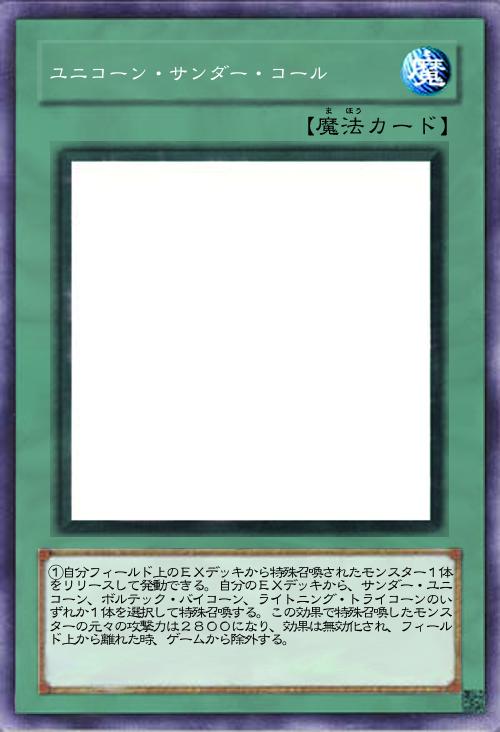 | ①自分フィールド上のEXデッキから特殊召喚されたモンスター1体をリリースして発動できる。自分のEXデッキから、サンダー・ユニコーン、ボルテック・バイコーン、ライトニング・トライコーンのいずれか1体を選択して特殊召喚する。この効果で特殊召喚したモンスターの元々の攻撃力は2800になり、効果は無効化され、フィールド上から離れた時、ゲームから除外する。 | |||