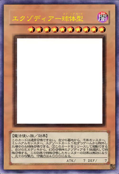 | このカードは通常召喚できない。自分の墓地から、千年モンスター、ミレニアムモンスター、エグゾードカード1枚ずつゲームから除外した場合のみ特殊召喚できる。②このカードをリリースして発動できる。自分のEXデッキから、幻の召喚神エクゾディアを1体選択して特殊召喚する。この効果で特殊召喚したモンスターの効果は無効になり、元々の攻撃力、守備力は4000になる。 | |||