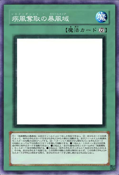 | ①:「疾風奪取の暴風域」は自分フィールド上に1枚しか存在できない。②:自分のカードの効果によって、相手の手札のカードを自分の手札に加えた場合に発動する。自分フィールド上の風属性モンスターの攻撃力は500アップする。③:1ターンに1度自分の公開されている手札のカードの枚数によって以下の効果のうち1つを選んで発動できる。●1枚以上:このターン自分のS召喚成功時に相手はカードを発動できない。●2枚以上:自分の墓地のSモンスター以外の「疾風奪取」モンスター1体を特殊召喚する。●3枚以上:相手の手札をランダムに1枚自分の手札に加える。その後、自分は手札を1枚捨てる。この効果の発動と効果は無効にならず、この効果で手札に加えたカードが手札に存在する限り、自分はそのカードを公開し続けなければならない。 | |||