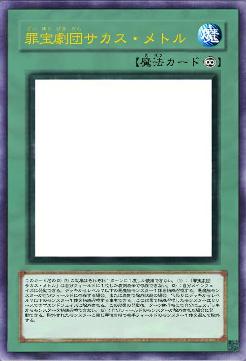 | このカード名の(2)(3)の効果はそれぞれ1ターンに1度しか使用できない。(1):「罪宝劇団サカス・メトル」は自分フィールドに1枚しか表側表示で存在できない。(2):自分メインフェイズに発動できる。デッキからレベル7以下の悪魔族モンスター1体を特殊召喚する。悪魔族モンスターが自分フィールドに存在する場合、または表側で除外状態の場合、代わりにデッキからレベル7以下のモンスター1体を特殊召喚する事もできる。この効果で特殊召喚したモンスターはリリースできずエンドフェイズに除外される。この効果の発動後、ターン終了時まで自分はEXデッキからモンスターを特殊召喚できない。(3):自分フィールドのモンスターが除外された場合に発動できる。除外されたモンスターと同じ属性を持つ相手フィールドのモンスター1体を選んで除外する。 | |||