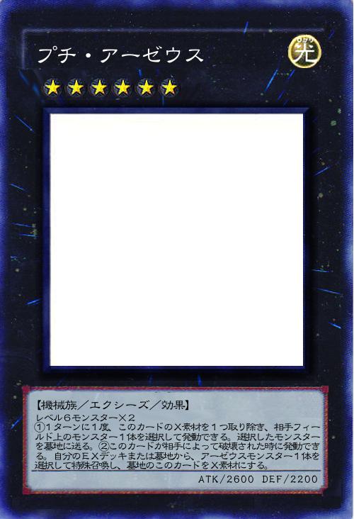 | レベル6モンスター×2 ①1ターンに1度、このカードのX素材を1つ取り除き、相手フィールド上のモンスター1体を選択して発動できる。選択したモンスターを墓地に送る。②このカードが相手によって破壊された時に発動できる。自分のEXデッキまたは墓地から、アーゼウスモンスター1体を選択して特殊召喚し、墓地のこのカードをX素材にする。 | |||