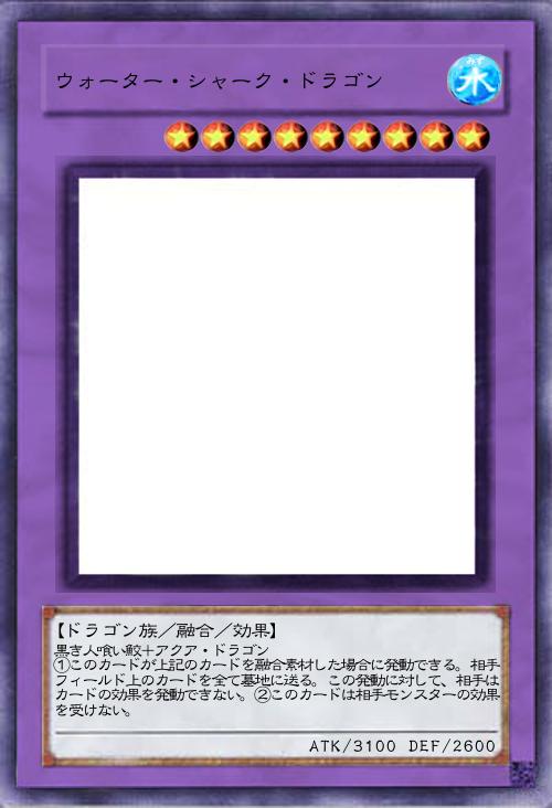 | 黒き人喰い鮫+アクア・ドラゴン ①このカードが上記のカードを融合素材した場合に発動できる。相手フィールド上のカードを全て墓地に送る。この発動に対して、相手はカードの効果を発動できない。②このカードは相手モンスターの効果を受けない。 | |||