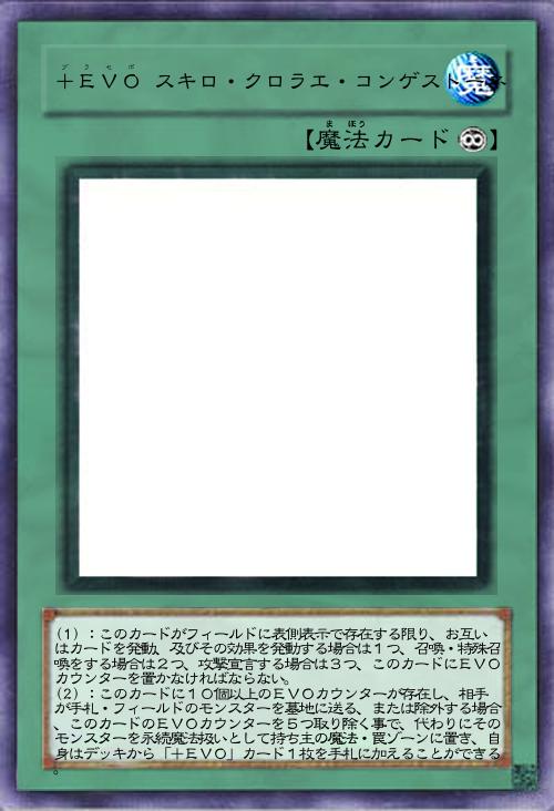 | (1):このカードがフィールドに表側表示で存在する限り、お互いはカードを発動、及びその効果を発動する場合は1つ、召喚・特殊召喚をする場合は2つ、攻撃宣言する場合は3つ、このカードにEVOカウンターを置かなければならない。 (2):このカードに10個以上のEVOカウンターが存在し、相手が手札・フィールドのモンスターを墓地に送る、または除外する場合、このカードのEVOカウンターを5つ取り除く事で、代わりにそのモンスターを永続魔法扱いとして持ち主の魔法・罠ゾーンに置き、自身はデッキから「+EVO」カード1枚を手札に加えることができる。 | |||