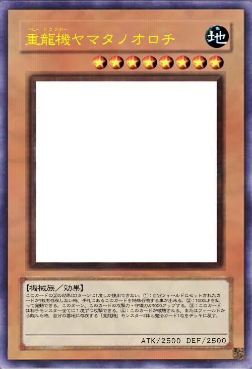| このカードの②の効果は1ターンに1度しか使用できない。①:自分フィールドにセットされたカードが1枚も存在しない時、手札にあるこのカードを特殊召喚する事が出来る。②:1000LPを払って発動できる。このターン、このカードの攻撃力・守備力が1000アップする。③:このカードは相手モンスター全てに1度ずつ攻撃できる。④:このカードが破壊される、またはフィールドから離れた時、自分の墓地に存在する「重龍機」モンスター2体と魔法カード1枚をデッキに戻す。 | |||