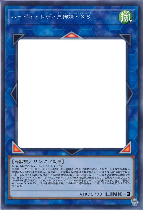| レベル4以下の「ハーピィ」モンスター3体 このカードが「ハーピィ・レディ三姉妹」をL素材としてL召喚する場合、そのカード1枚で必要なL素材分として扱う事ができる。このカード名の②③の効果はそれぞれ1ターンに1度しか使用できない。①:このカードは相手の罠カードの効果を受けない。②:お互いのバトルフェイズ開始時に発動できる。相手フィールドのモンスターはこのターンの終了時まで効果が無効となり、攻撃力・守備力はこのカードの攻撃力分ダウンする。③:フィールドのこのカードをリリースして発動できる。自分の墓地から「ハーピィ・レディ」3体を特殊召喚する。この効果で特殊召喚されたモンスターの攻撃力は2700となる。 | |||