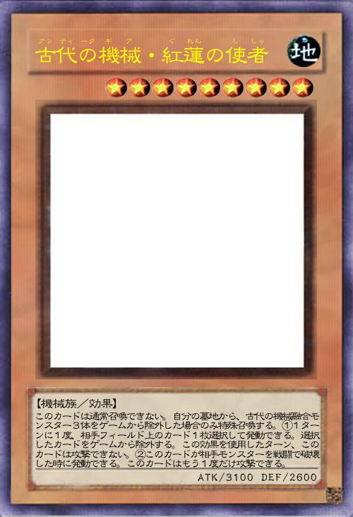 | このカードは通常召喚できない。自分の墓地から、古代の機械融合モンスター3体をゲームから除外した場合のみ特殊召喚する。①1ターンに1度、相手フィールド上のカード1枚選択して発動できる。選択したカードをゲームから除外する。この効果を使用したターン、このカードは攻撃できない。②このカードが相手モンスターを戦闘で破壊した時に発動できる。このカードはもう1度だけ攻撃できる。 | |||