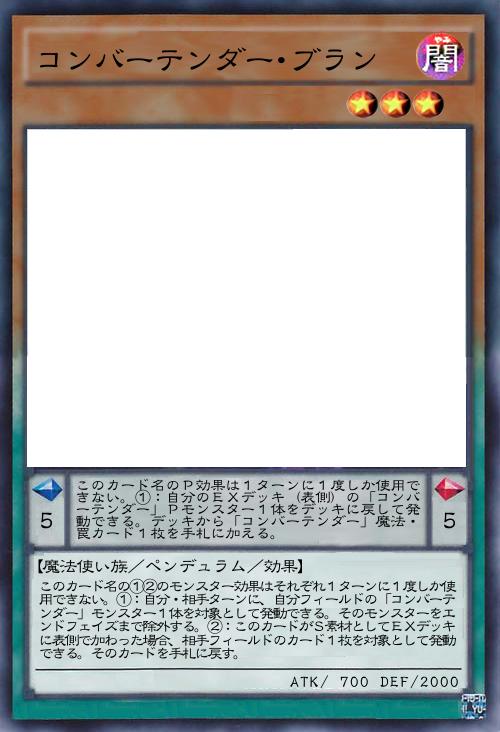 | このカード名のP効果は1ターンに1度しか使用できない。①:自分のEXデッキ(表側)の「コンバーテンダー」Pモンスター1体をデッキに戻して発動できる。デッキから「コンバーテンダー」魔法・罠カード1枚を手札に加える。 | |||
