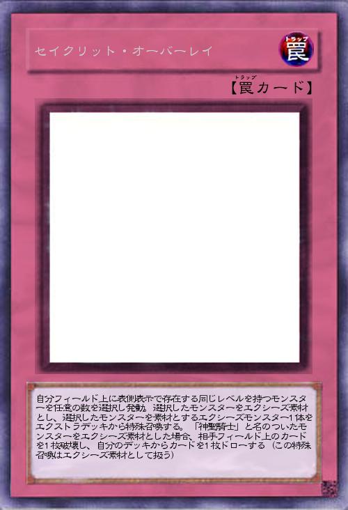 | 自分フィールド上に表側表示で存在する同じレベルを持つモンスターを任意の数を選択し発動。選択したモンスターをエクシーズ素材とし、選択したモンスターを素材とするエクシーズモンスター1体をエクストラデッキから特殊召喚する。「神聖騎士」と名のついたモンスターをエクシーズ素材とした場合、相手フィールド上のカードを1枚破壊し、自分のデッキからカードを1枚ドローする(この特殊召喚はエクシーズ素材として扱う) | |||
